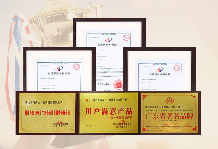 通過ISO9001認證,國家建筑材料測試中心和中國有色金屬華南產品質量監督檢驗中心合格檢測,符合美國建筑制造商協會AAMA2605-98涂層標準,被國家建設部認定為建筑鋁合金外墻板、鋁合金天花板定點生產企業。